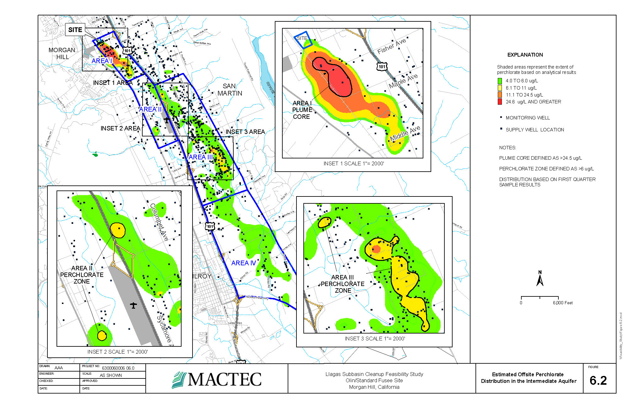 Perchlorate distribution in the intermediate aquifer at Olin/Standard Fusee site. Plumes created by hydrogeologists and imported to GIS.